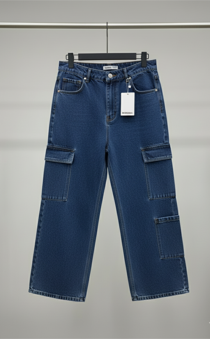 Make a bold utilitarian statement with the Bershka Wide-Leg Dark Denim Cargo Jeans. This pair delivers the season’s hottest silhouette—the oversized, ultra-wide leg—in a rich, dark wash that easily dresses up or down.