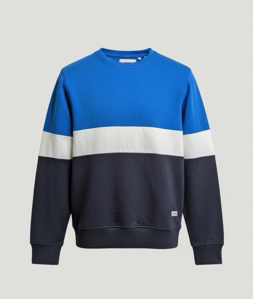 ntroducing a timeless classic with a modern twist. This crewneck sweatshirt features a clean, horizontal three-block design in vibrant Royal Blue, crisp White, and deep Navy. Crafted from soft, comfortable material with a relaxed fit, ribbed trims, and a simple, unbranded chest for a minimalist aesthetic. Perfect for effortless layering and everyday comfort with a retro sports feel